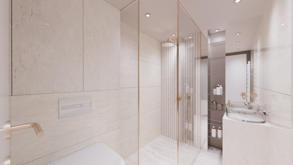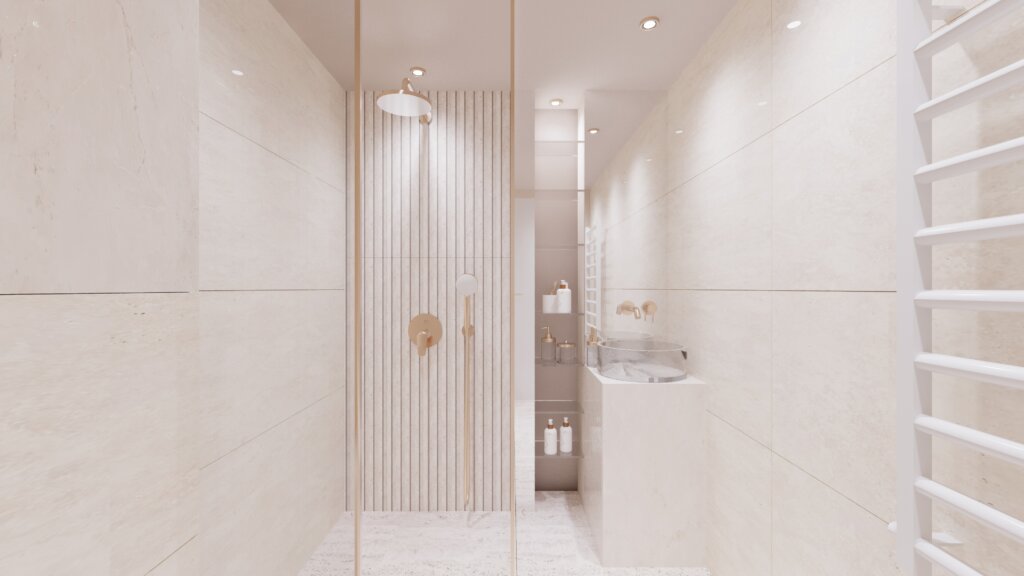 A koncepciót a meleg fafelületek, travertin kőhatású elemek és lágy, hajlított formák határozzák meg. A falpanelekkel, gardróbfalakkal és tükörrel burkolt előszoba-fürdő blokkal vizuálisan is tágítottam a teret. Minden részlet a harmónia és funkcionalitás egyensúlyát szolgálja – az anyaghasználattól a bútorarányokig.